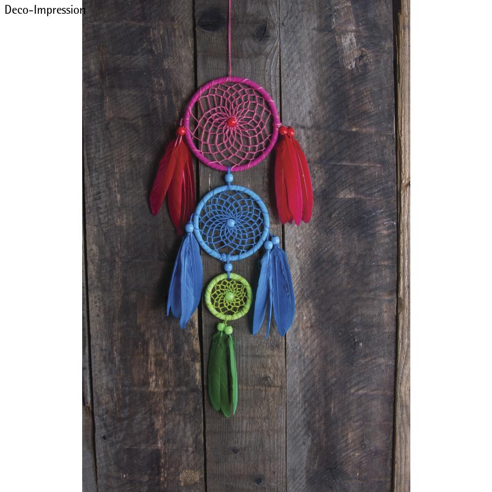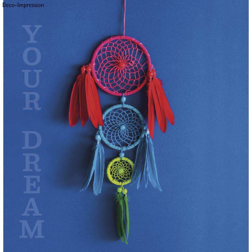 Inhalt des Sets: 3 Metall-Ringe (groß, mittel, klein) 16 Perlen 1 Plastiknadel 20 Federn Band, Lederimitat (100 cm, 90 cm, 50 cm) Garn (3 Stränge, je 3,50 m) Anleitun.