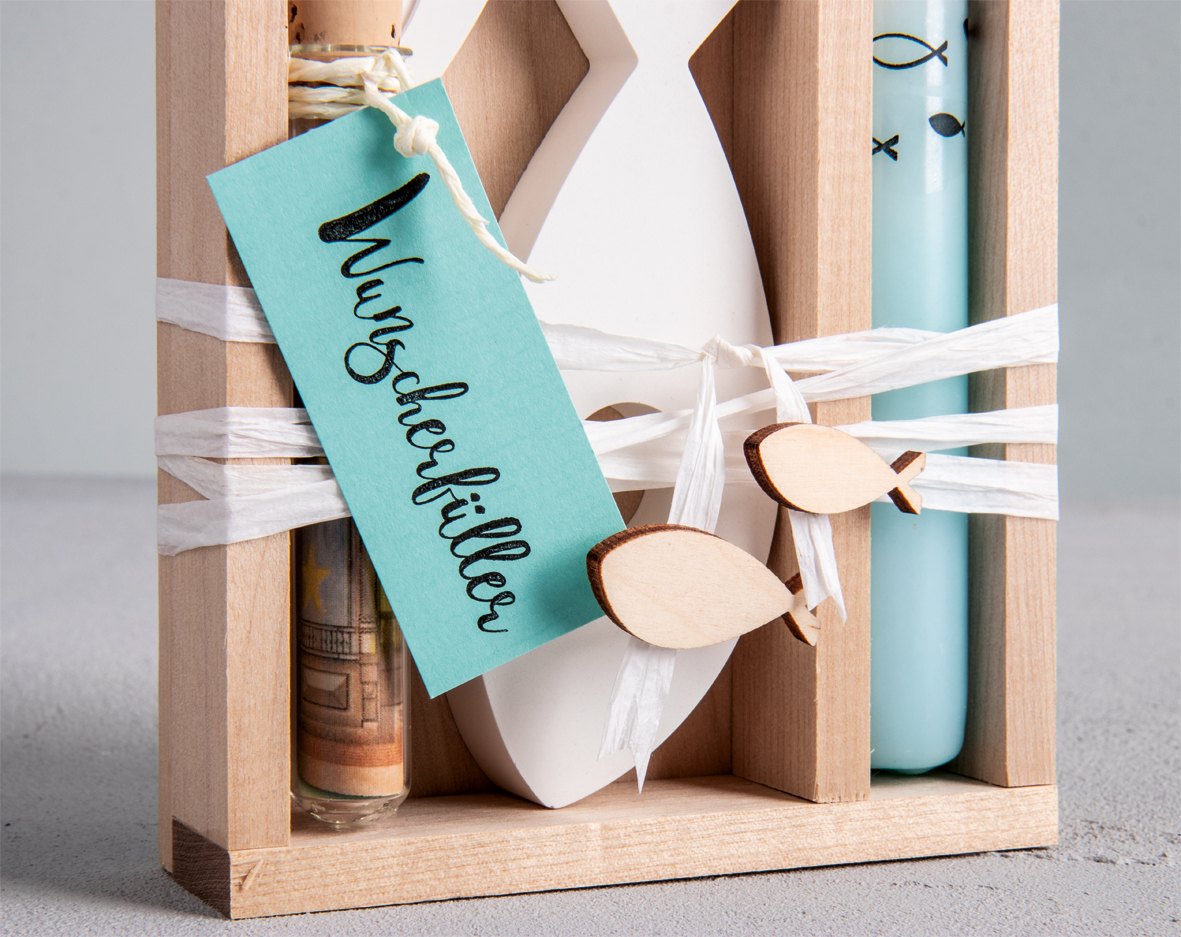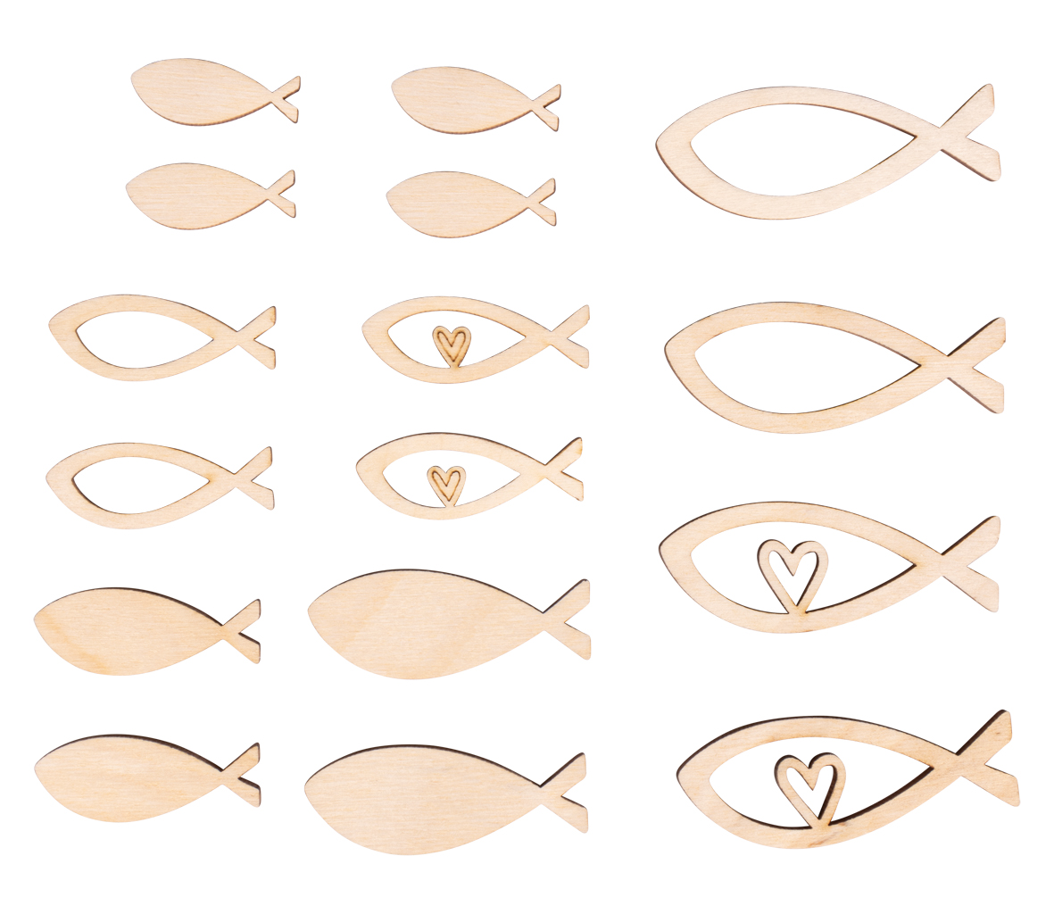 Inhalt: 16 Holzfische in verschiedenen Größen 4 – 6 cm und Designs. Filigran gelasert, zum Teil mit Herzchen. Größe der kleinsten Fische: 1 x 3 cm (Breite/Länge), größte Fische 2 x 6 cm, Stärke 3 mm stark.