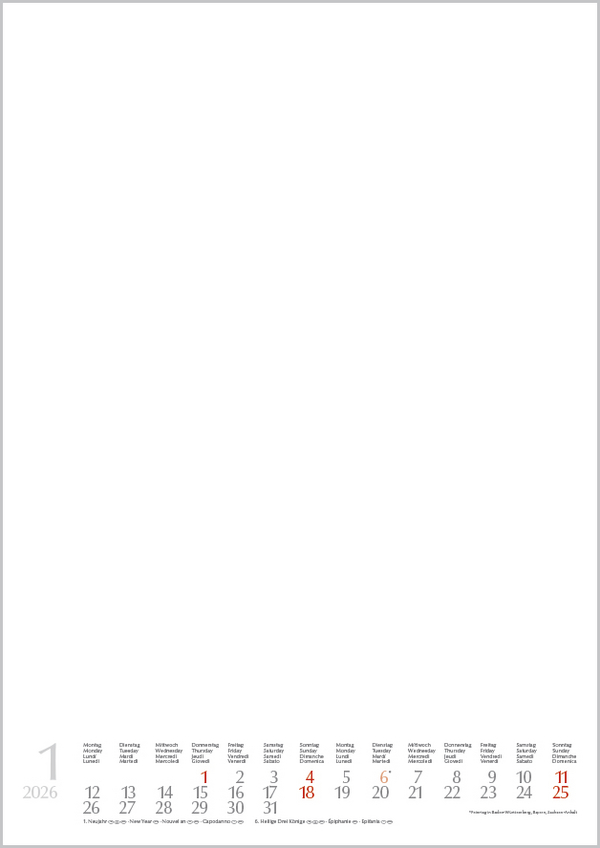 • Mehrsprachiges Kalendarium mit Feiertagen für Deutschland, Österreich und Schweiz